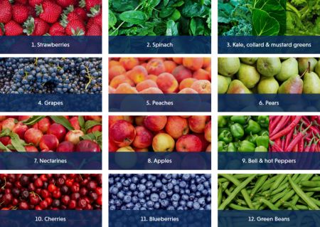 1. 草莓、2. 菠菜、3. 羽衣甘蓝和芥菜、4. 葡萄、5. 桃子、6. 梨、7. 油桃、8. 苹果、8. 葡萄、9. 灯笼椒和辣椒、10. 樱桃、11. 蓝莓、12. 青豆。