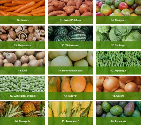环境工作组织还公布一份最干净的15种蔬果名单,评选出农药残留最少的农产品。分别为:1. 牛油果、2. 甜玉米、3. 菠萝、4. 洋葱、5. 木瓜、6. 冷冻甜豌豆、7. 芦笋、8. 蜜瓜、9. 猕猴桃、10. 卷心菜、11. 西瓜、12. 蘑菇、13. 芒果、14. 红薯、15. 胡萝卜。