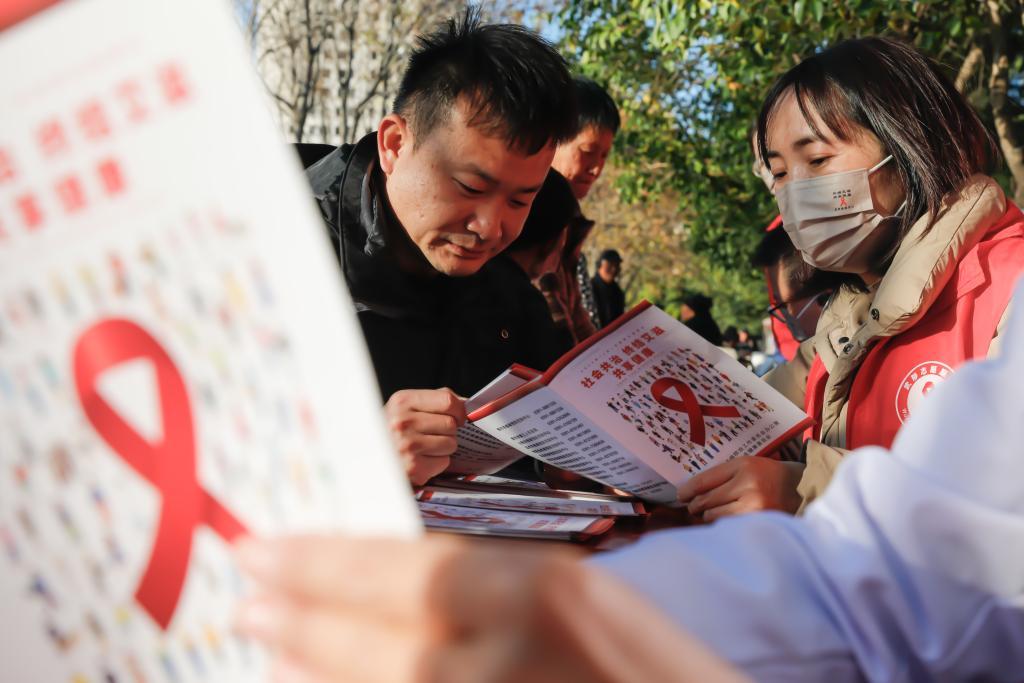 11月29日,在河南省焦作市武陟县龙泉湖公园,疾病预防控制中心工作人员向市民宣传艾滋病防治知识。新华社发(王琳锋摄)
