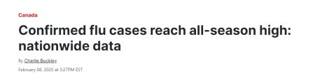 全国数据显示,上周流感检测阳性率达到21.2%,创下全季新高,超过了2023-24年流感季节的18.7%的峰值。据CP24报道,上周五更新的联邦政府健康信息库仪表板显示,2月1日当周流感检测结果为8,586例,大多数集中在65岁或以上的加拿大人中。