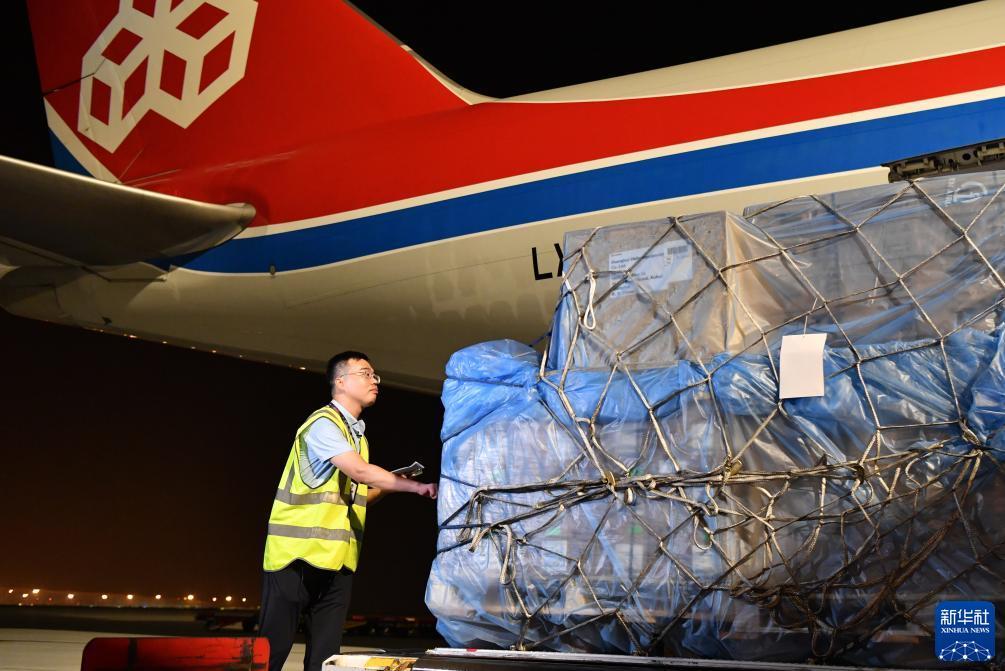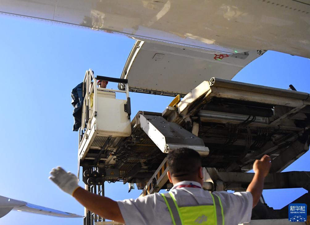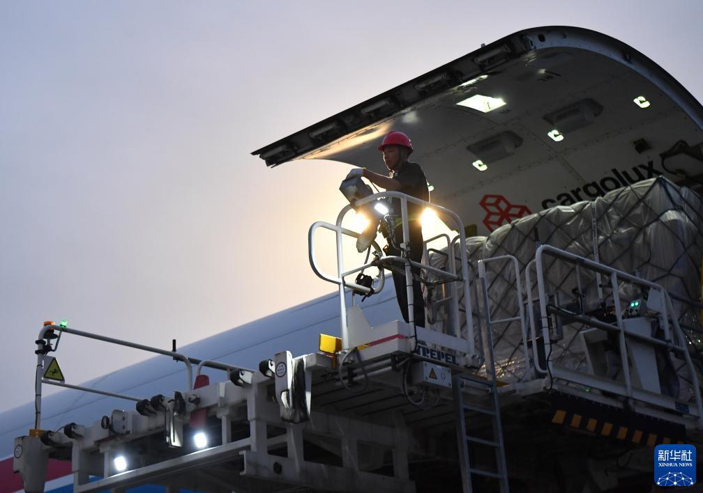 8月1日,工作人员在中国郑州新郑国际机场为一架卢森堡货航货机装货。新华社记者 李嘉南 摄