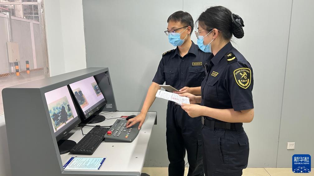 8月2日,中国郑州机场海关关员用X光机对进口货物开展非侵入式查验。新华社发(郑州机场海关供图)