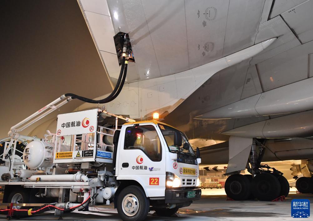 8月1日,在中国郑州新郑国际机场,中国航油华南蓝天河南分公司的工作人员为一架卢森堡货航货机加油。新华社记者 李嘉南 摄