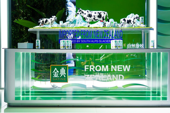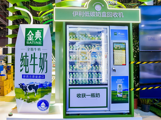 此次进博会上,伊利还精心搭建了“灵动之境”展台,展厅全部采用绿色减碳材料,设置“奶盒回收机”,观众喝完牛奶后将空盒投入“回收口“,即可在下方出奶口得到一包伊利金典新西兰纯牛奶。