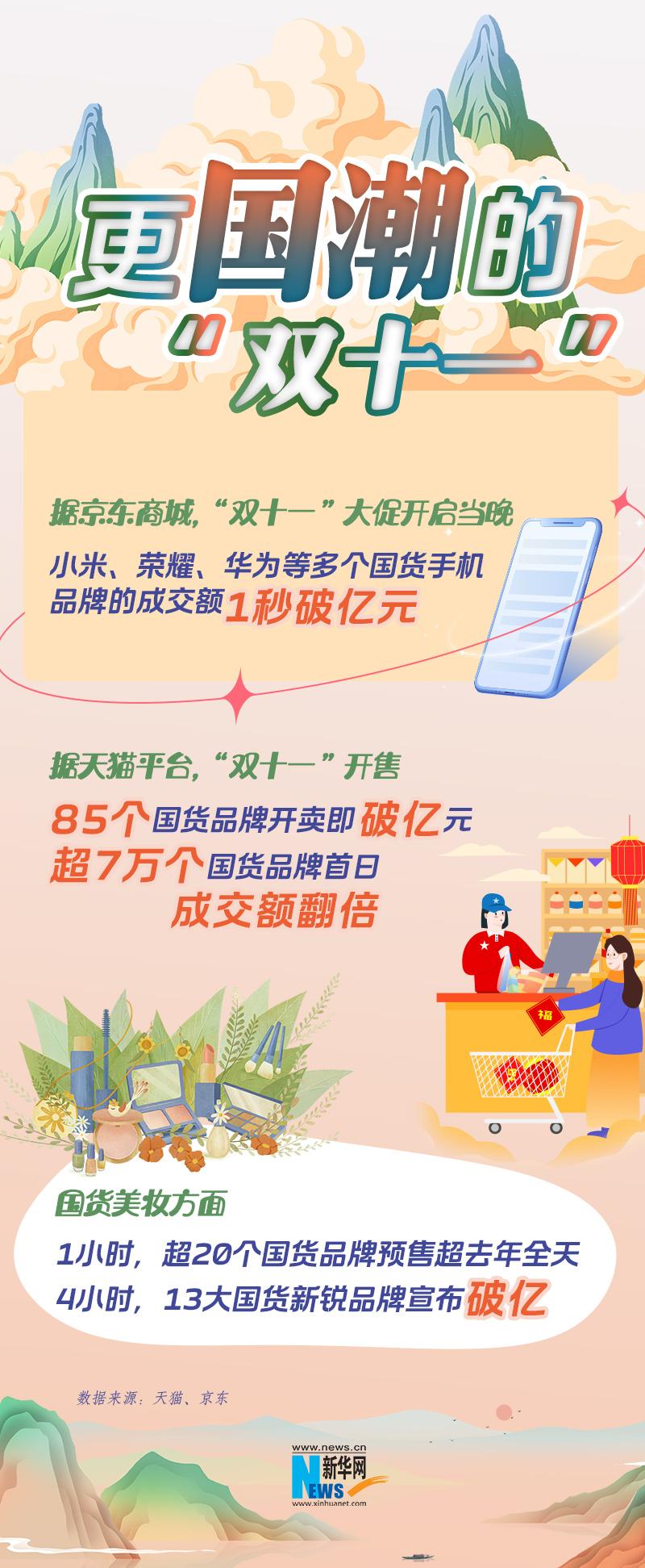 公开数据显示,10月23日京东“双十一”开启当晚,小米、荣耀、华为等多个国货手机品牌的成交额1秒破亿元;10月31日晚天猫“双十一”正式开售,85个国货品牌开卖即破亿元,超7万个国货品牌首日成交额翻倍。