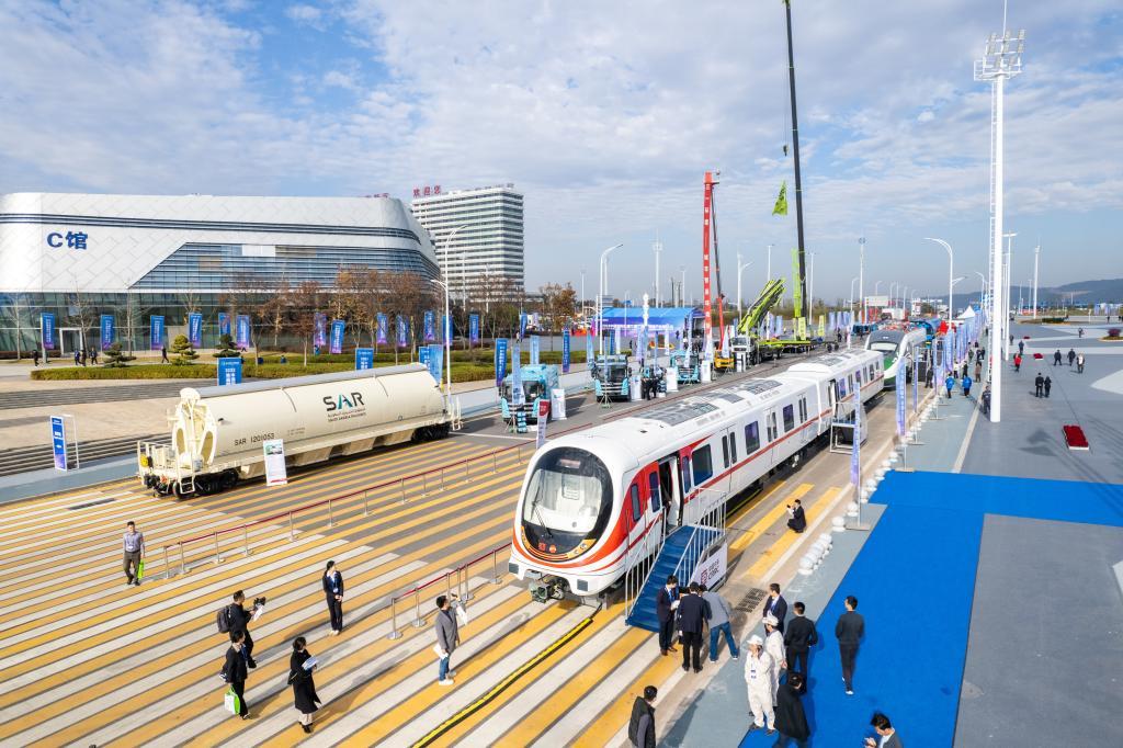 12月8日在株洲国际会展中心拍摄的列车户外展示区(无人机照片)。新华社记者 陈思汗 摄