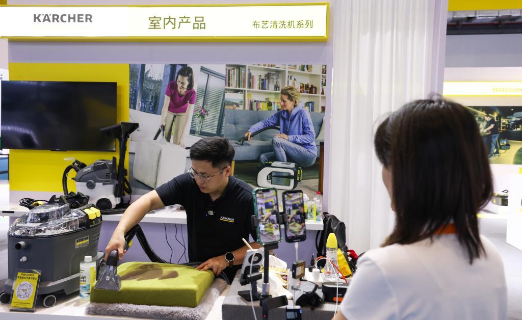 “友友们,现在进入‘云’逛消博会时间,大家可以通过直播试擦,感受这款镜面清洁机的功能。”一边在展台发布新品,一边引导消费者进入直播间购买,卡赫现场工作人员陈女士忙得不亦乐乎。据她介绍,这是公司第一次在消博会上使用直播带货形式,“效果不错,刚刚就有不少粉丝下单”。