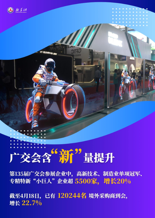 据统计,在本届广交会参展企业中,国家级高新技术企业、制造业单项冠军、专精特新“小巨人”企业超5500家,比上一届增长20%。截至4月18日,累计已有来自全球212个国家和地区的120244名境外采购商线下到会,比上届同期增长22.7%。
