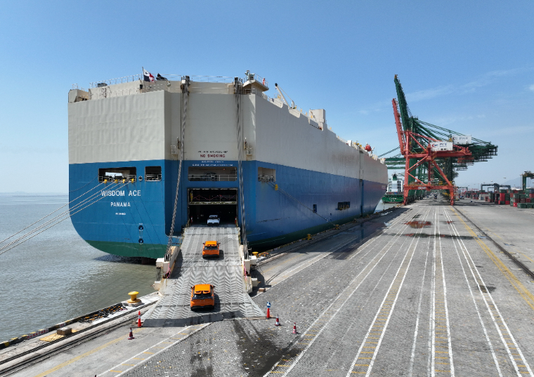 3月12日,上汽集团乘用车福建宁德基地生产的车辆从福州港江阴港区驶上远洋滚装轮(无人机照片)。新华社记者 林善传 摄