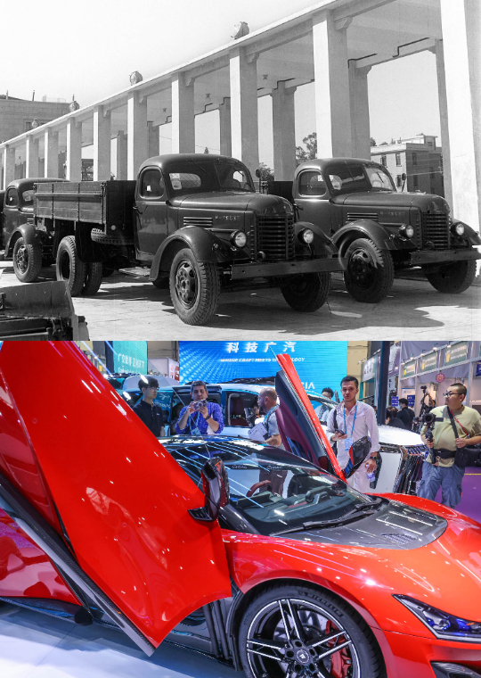 这是一张拼版照片。上图为1957年春,首届广交会上展出的解放牌汽车(资料照片);下图为2024年4月15日,第135届广交会上展示的广汽新能源超跑吸引了众多采购商的目光(新华社记者刘大伟摄)。 新华社发