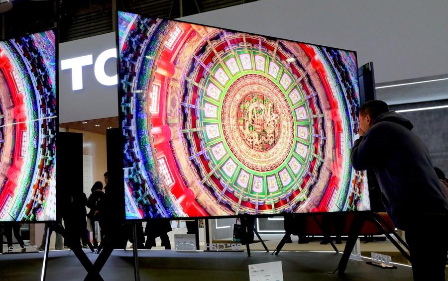 图为一名参观者在TCL公司展台上近距离观察一款电视展品的屏幕。(新华社记者 方喆 摄)