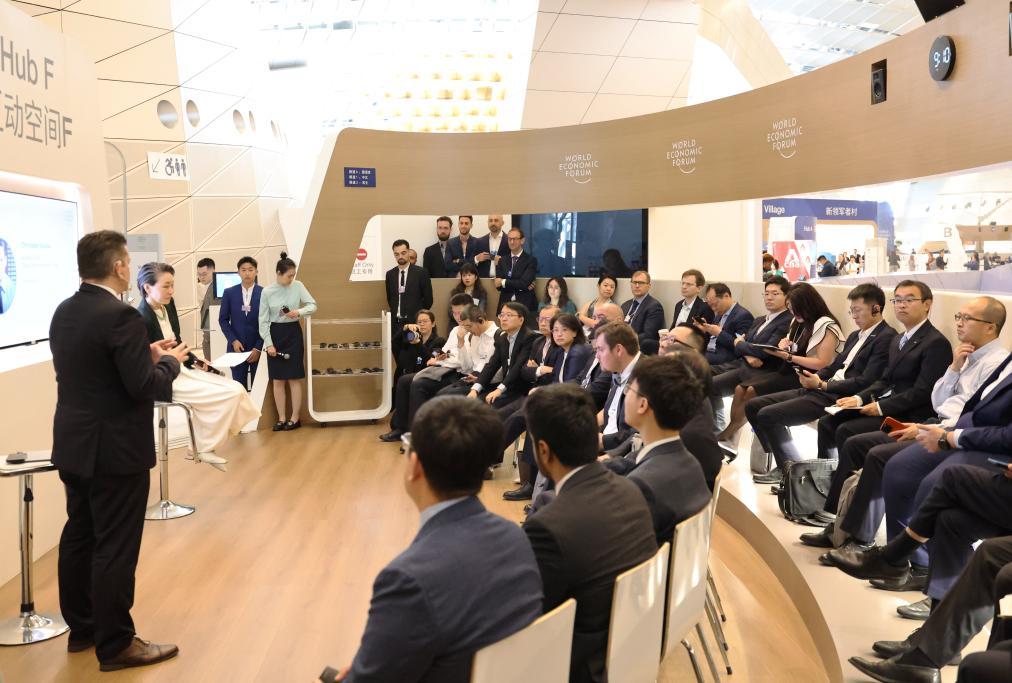 6月26日,在夏季达沃斯论坛主会场大连国际会议中心,嘉宾参与互动讨论。新华社记者 李钢 摄