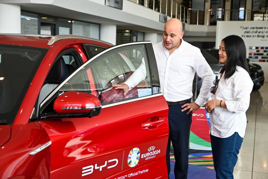 2024年5月29日,在马耳他比尔基卡拉,马耳他哈桑-扎米特汽车公司首席执行官德古阿拉(左)介绍一辆比亚迪纯电动汽车。新华社发(乔纳森·博格 摄)