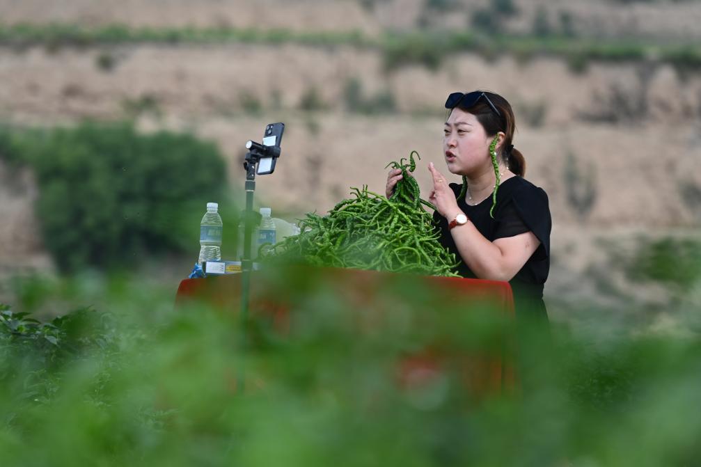在天水市甘谷县新兴镇侯家沟村的辣椒生产基地,工作人员直播销售辣椒。新华社记者 范培珅 摄