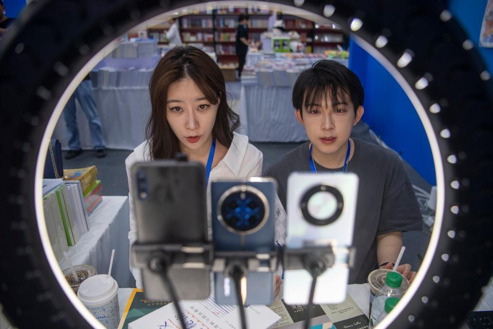 9月27日,工作人员在“书香长江”阅读周·武汉书展上直播售书。新华社记者 伍志尊 摄