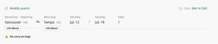航班于上午 9:20 从温哥华起飞,下午 5:43 到达坦帕;返回航班于下午 6:40 从坦帕起飞,晚上 7:54 到达温哥华,往返票价低于 400 元,起价低于 350 元。例如7 月 9 日出发、7 月 12 日返回的直飞航班票价为 344.14 元。