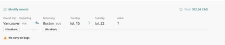 "UltraBasic" 的最基本票价的确是比较便宜,但同时也带来了非常严格的限制,加拿大人对此非常不满。选择这种最基本票价的乘客不能携带随身行李,除非您购买了所有航班(包括转机)的 "扩展舒适(Extended Comfort)" 选项。可以免费携带一个小到足以放在您前面座位下面的私人物品,如钱包、背包,也可以提前托运行李,但需要支付额外费用。
