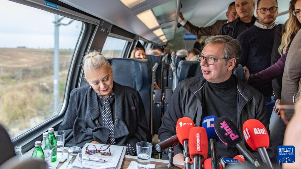 10月3日,塞尔维亚总统武契奇(右)乘坐匈塞铁路列车从首都贝尔格莱德市前往苏博蒂察市。新华社发(王韡摄)