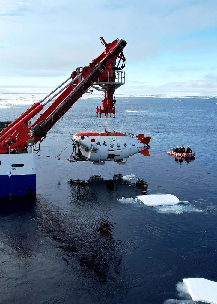 “蛟龙”号载人潜水器在北极冰区下潜。新华社记者刘诗平 摄