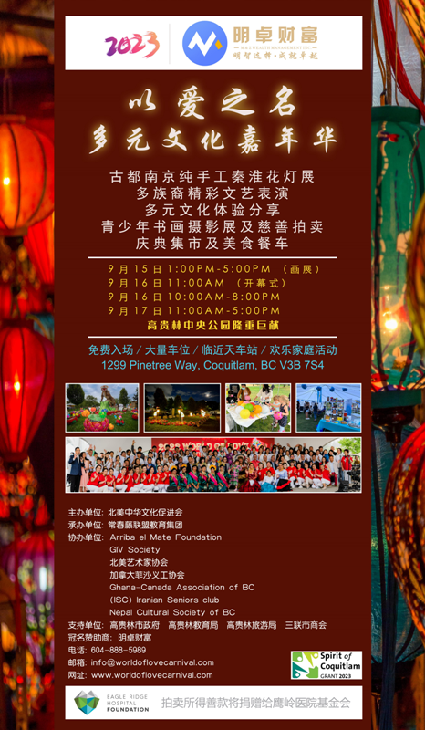 北美中华文化促进会会长吴昀娟感谢社会各界的支持和大家的到来,她说,今年的活动将在“多族裔节目表演、商品集市、美食餐车、秦淮灯展”这四大主题板块的基础上新增了首届“同一个世界同一片天空”加拿大世界青少年书画展及慈善拍卖的活动板块。到目前为止组委会收到了来自欧洲、亚洲、美洲地区的参赛作品百余幅,计划在这个月底前完成评选工作,9月15号将在嘉年华活动主会场高贵林中央公园展出获奖作品,9月16号嘉年华正式活动当天,举办现场慈善拍卖,拍卖所得的善款将全部捐赠给鹰岭医院(Eagle Ridge Hospital)基金会。届时欢迎我们各位朋友们一起来参与慈善拍卖献爱心的活动。