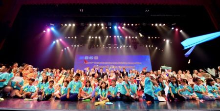 选手、嘉宾、演员手持纸飞机,放飞梦想,传递友爱