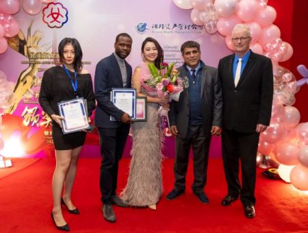 晚会荣誉主席Peter Fu和徐凌会长颁奖给获奖者:Richmond Lahoo Lions Club列治文乐虎狮子会执行会长Alyssa Liu、前会长Chris Qiu、Richmond Lahoo Lions Club 列治文乐虎青狮会督导老师Mingfei Yuan、Philippine Cultural Heritage Society。