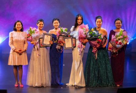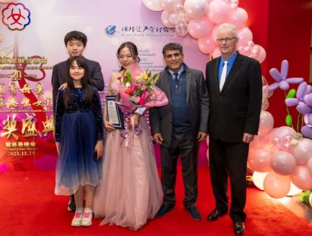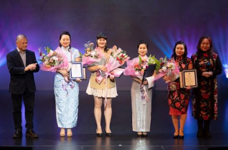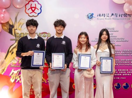 温哥华中华会馆理事长钱华、大温哥华中华文化中心主席郭英华颁发给获奖者:Catherine Li 李玉苗、Sophia He 何虹、Anna Cao 曹娜、Jarry Zhang 张豫。