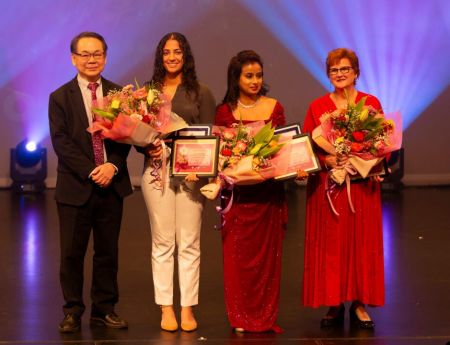 列治文市议员区泽光颁奖给获奖者:Nancy Hermiston、Antara Deb、Sonia Andhi Bilkhu