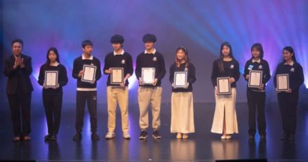 本那比市议员王白进颁奖给获奖者:Ophilia Lu (不在现场)、Amy He、Tiffany Zhang、Felicity Zeng、Nathalie Dai、Devin Yue、Brain Guo、Anthony He、Alyssa Ma。