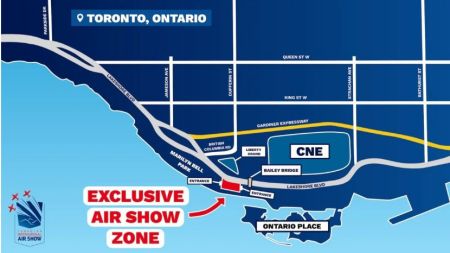 Marilyn Bell公园(地址:1095 Lake Shore Blvd. West):CNE专属航空展区的所在地,普通门票80元,提供私人观赏区。高级票持有者可以享受开放式酒吧、午餐自助餐(包括肉类、素食、素食选项、配菜、沙拉和美味甜点)。