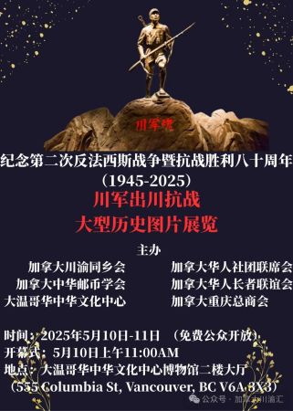 2025年4月22日上午,由加拿大川渝同乡会、加拿大华人社团联席会、加拿大中华邮币学会、加拿大华人长者联谊会、大温哥华中华文化中心和加拿大重庆总商会等华人社团共同主办的《川军出川抗战大型历史图片展览》新闻发布会在素里市中心图书馆举行。