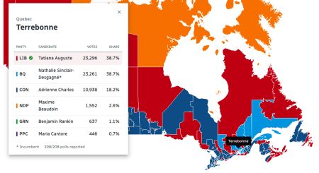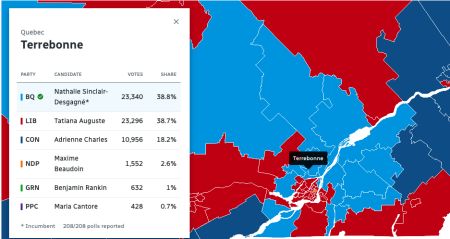 但加拿大选举署现在报告称,在验证过程中再次核对数字后,魁人政党实际上反而是以44票的优势在该选区领先。魁人政团现任议员德斯加涅(Nathalie Sinclair-Desgagné)获得23,340票,而自由党候选人奥古斯特(Tatiana Auguste)获得23,296票。