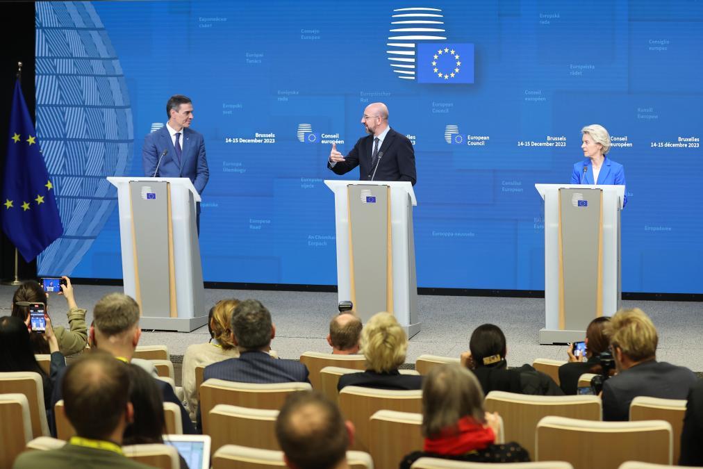 欧盟峰会聚焦冲突 成员分歧难达一致。12月15日,在比利时布鲁塞尔,欧洲理事会主席米歇尔(中)、欧盟委员会主席冯德莱恩(右)、西班牙首相桑切斯在欧盟峰会期间出席新闻发布会。新华社记者赵丁喆摄
