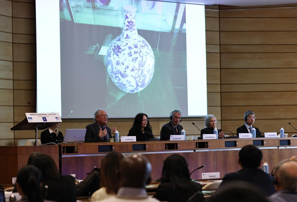 4月15日,在位于法国巴黎的联合国教科文组织总部举行的“文明交流互鉴理念国际研讨会”上,中外嘉宾参加“丝绸之路:人类文化交流的璀璨乐章”分组讨论。新华社记者高静摄