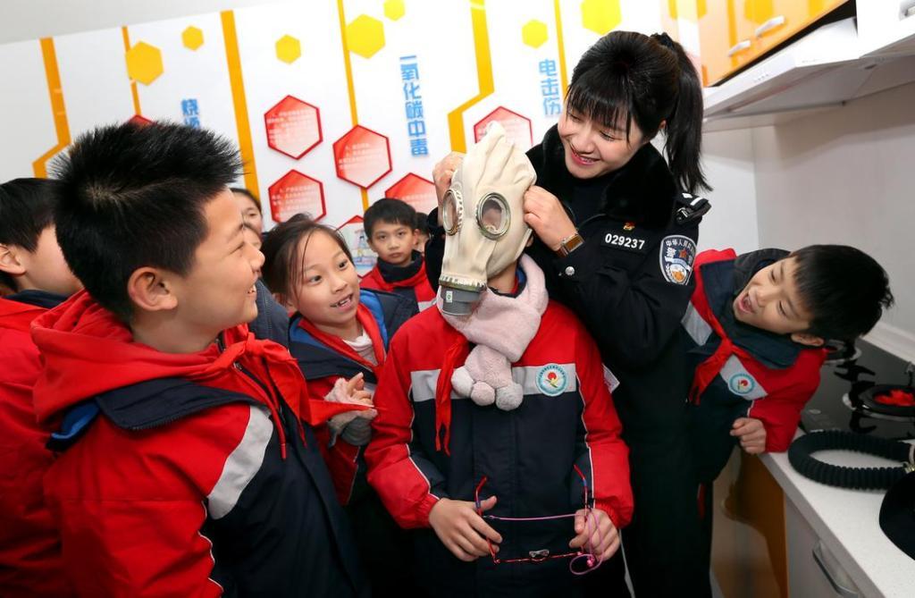 2020年1月10日,上海市公安局普陀分局真如派出所民警在给小学生讲解如何正确佩戴消防自救呼吸器。新华社记者 凡军 摄