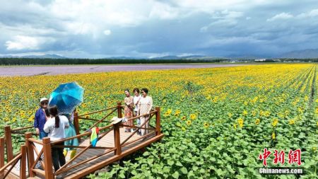 游客在盛开的向日葵间拍照打卡。