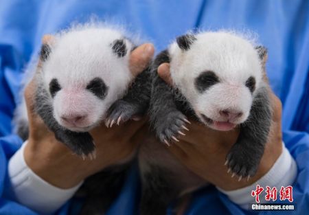 当地时间8月7日,韩国三星爱宝乐园公布雌性双胞胎大熊猫幼崽(左为姐姐,右为妹妹)于6日拍摄的满月照。