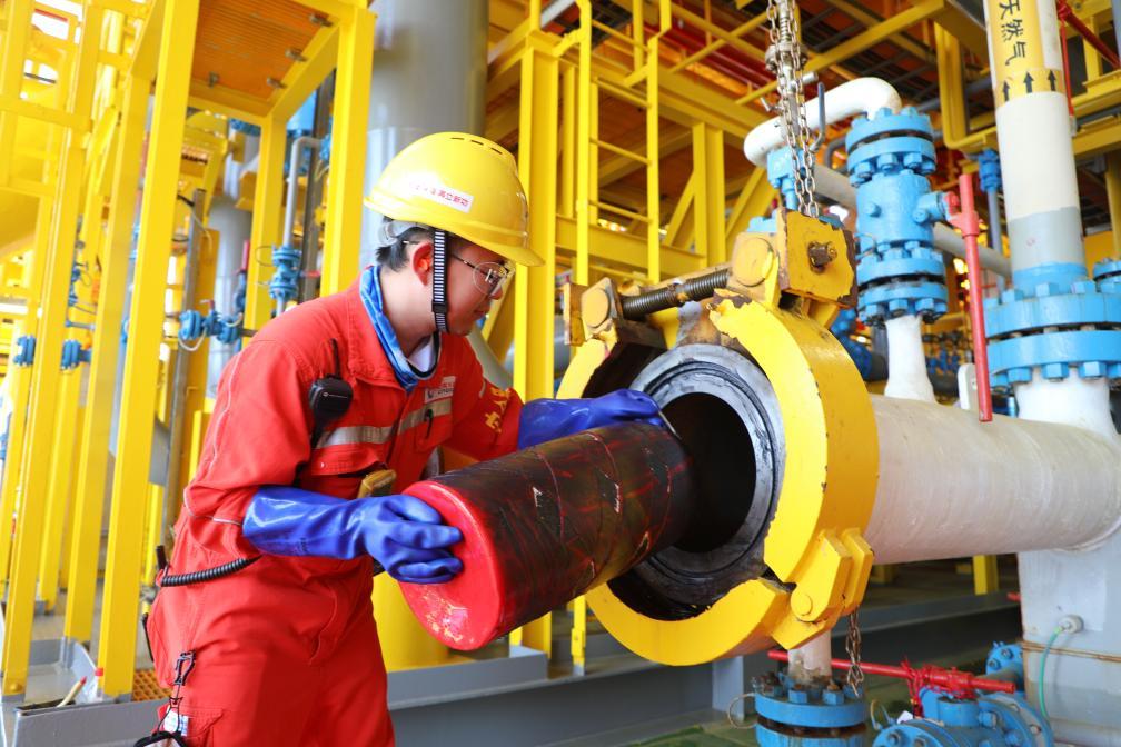 现场作业人员把清管球放入发球筒。(中国海油供图)