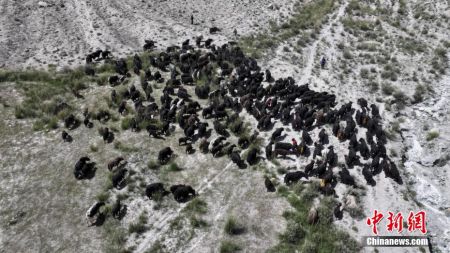 阿克陶县12万头帕米尔牦牛翻雪山穿峡谷,陆续将从夏季牧场前往秋季牧场。(无人机照片)