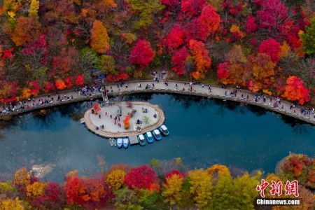 本溪市素有“燕东胜境”之称,拥有“枫叶、奇洞、名山、秀水、温泉、民俗”六大名片。图为本溪大石湖风景区枫叶满山,溪水潺潺。(