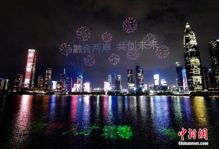 11月11日晚,海峡两岸交流融合月无人机灯光表演秀在深圳人才公园上演。现场有1000余名台商台胞台青代表以及参加第四届海峡两岸学生棒球联赛总决赛的两岸800余名学生教练一同观看。(中新社记者 陈文 摄)