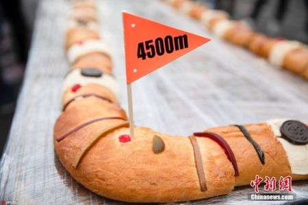 近日,墨西哥首都墨西哥城,民众制作出一条长达4500米的面包,创造了一项新的吉尼斯世界纪录。据悉,这条面包由民众摆放的18000多块面包组成。(