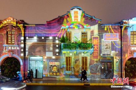 夜幕下的张园老建筑在变色灯光的点缀下更显石库门海派风格的魅力。而在外面的茂名北路上,继续上演炫彩灯光秀。各种不同图案的多媒体影像投影在张园石库门建筑的立面上,仿若时空穿越,吸引众多的市民路人纷纷驻足观赏拍摄。(图/视觉中国)