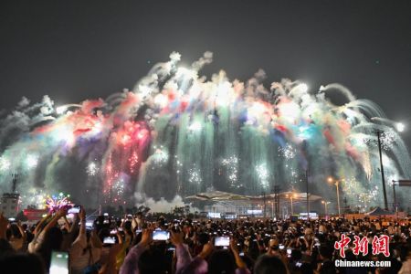 5月3日,“焰遇浏阳河·烟花星球奇幻夜”烟花秀在湖南浏阳上演。烟花秀以五大行星为线索展现多场景表演,千架无人机与烟火配合,带领现场观众感受烟花中的梦幻星河。图为“七彩祥云”烟花亮相夜空。(中新社记者 杨华峰 摄)