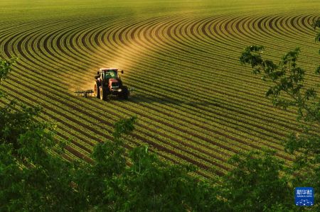 6月11日,在黑龙江省嫩江市,北大荒集团黑龙江省九三前源农副业有限责任公司农机工人进行除草作业(无人机照片)。