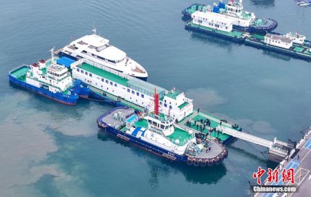 6月26日,“氢电拖1”轮靠泊在码头。当日,中国首艘氢电拖轮“氢电拖1”轮26日在山东港口青岛港投用。据测算,较传统燃油拖轮,该轮预计每年可减少二氧化碳排放量达1500余吨,标志着中国在氢能船舶应用领域实现突破。(无人机照片 张进刚 摄)