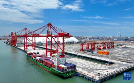 7月2日,集装箱船舶靠泊在东营港一突堤集装箱码头(无人机照片)。