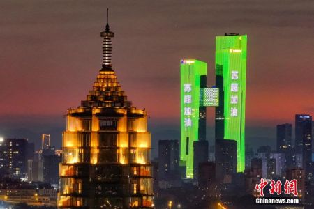 7月3日晚,南京地标建筑亮出“苏超加油”“十三太保一家亲”“跟着苏超游南京”“为选手喝彩”等字样,为即将举行的2025江苏省城市足球联赛(苏超)新一轮比赛加油助威。(无人机照片
