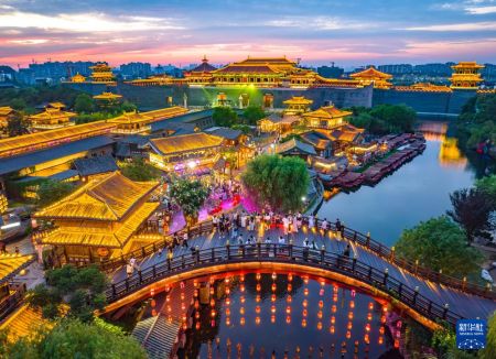 8月11日,湖北省襄阳市唐城景区夜景璀璨,吸引游客前来游玩(无人机照片)。