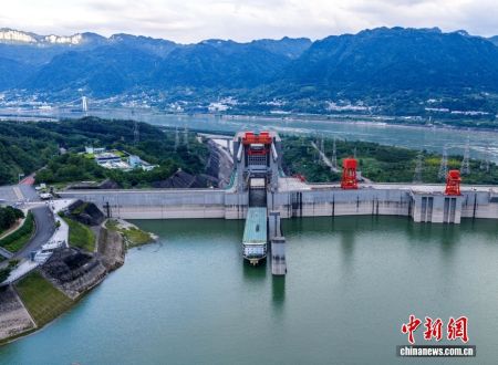 长江三峡通航管理局统计数据显示,截至8月15日,三峡升船机累计客运量突破200万人次。作为三峡工程的重要通航建筑物之一,三峡升船机是目前世界上规模最大、技术难度最高的全平衡垂直升船机,最大提升高度113米,可将3000吨排水量的船舶快速提升过坝。图为8月15日,湖北宜昌,一艘游轮通过三峡升船机“翻越”三峡大坝抵达上游水域。(无人机照片 中新社发 王罡 摄)